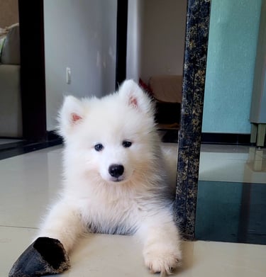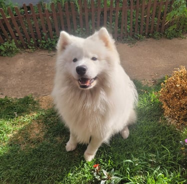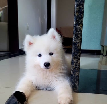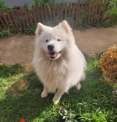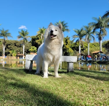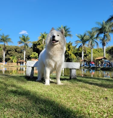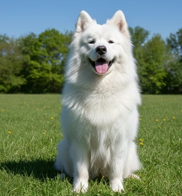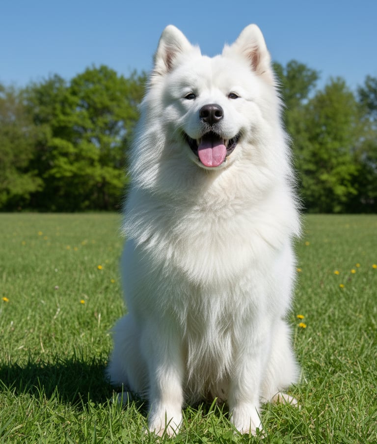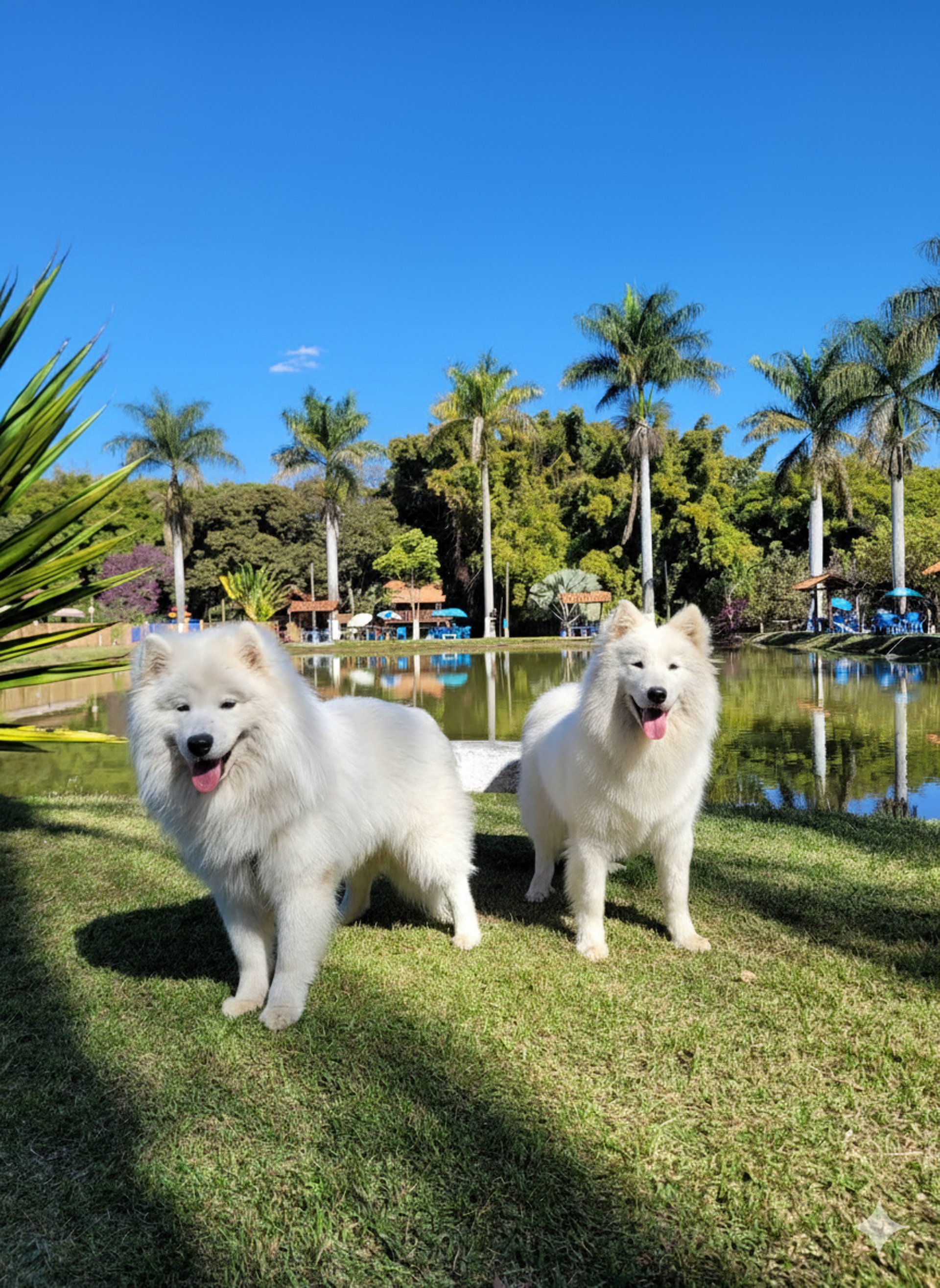 Com sua pelagem branca e fofa como a neve, o Samoieda encanta à primeira vista. Possui um sorriso marcante, olhar expressivo e orelhas triangulares sempre atentas. Seu pelo denso e macio forma uma linda “nuvem” ao redor do corpo, refletindo luz e pureza. Elegante e robusto, transmite ao mesmo tempo força, doçura e alegria.